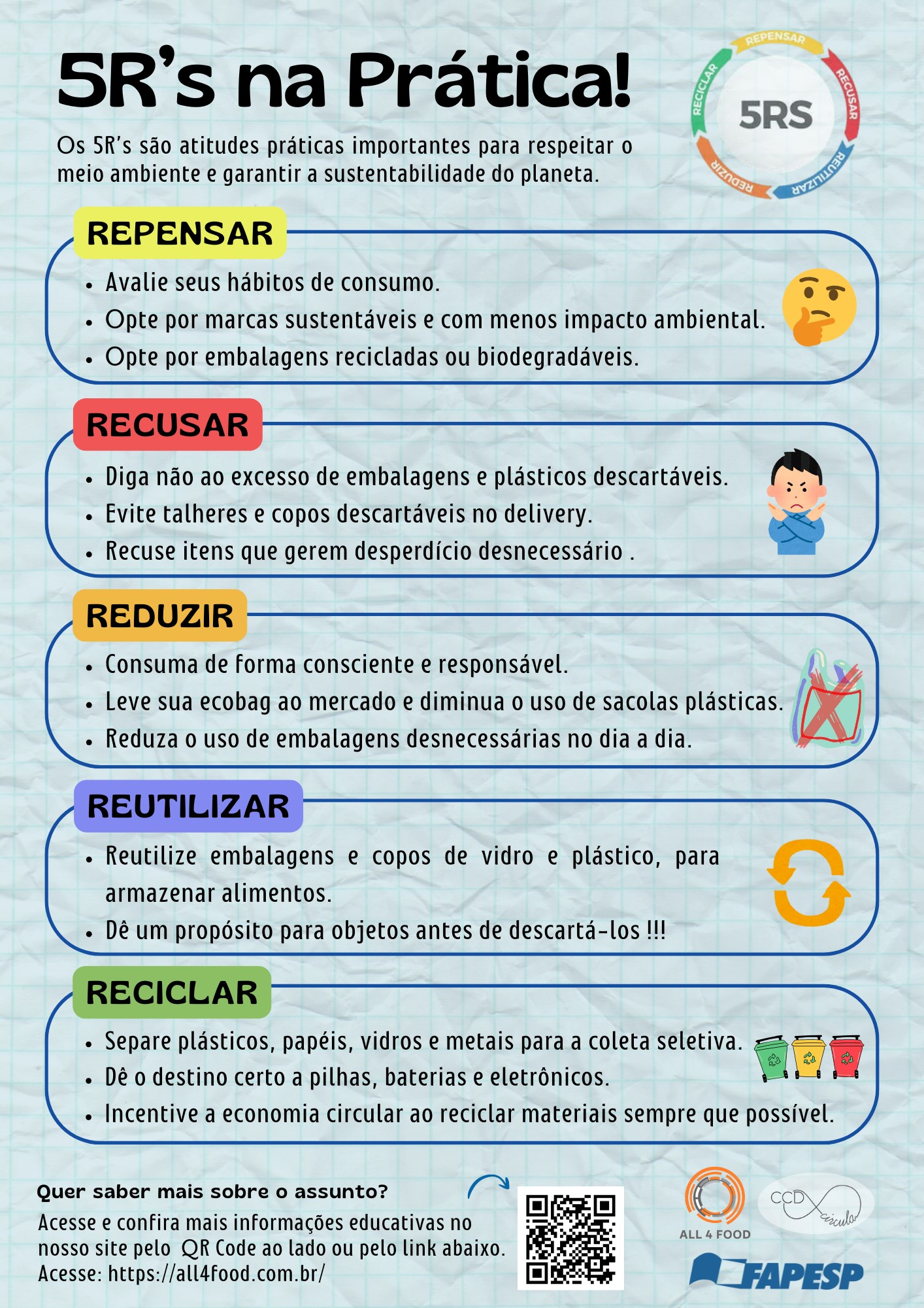 O infográfico apresenta os R’s na prática, que são atitudes para reduzir impactos ambientais, são eles: Repensar, Recusar, Reduzir, Reutilizar e Reciclar.