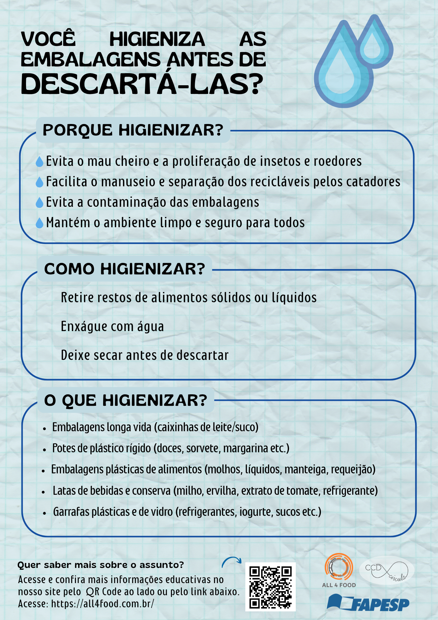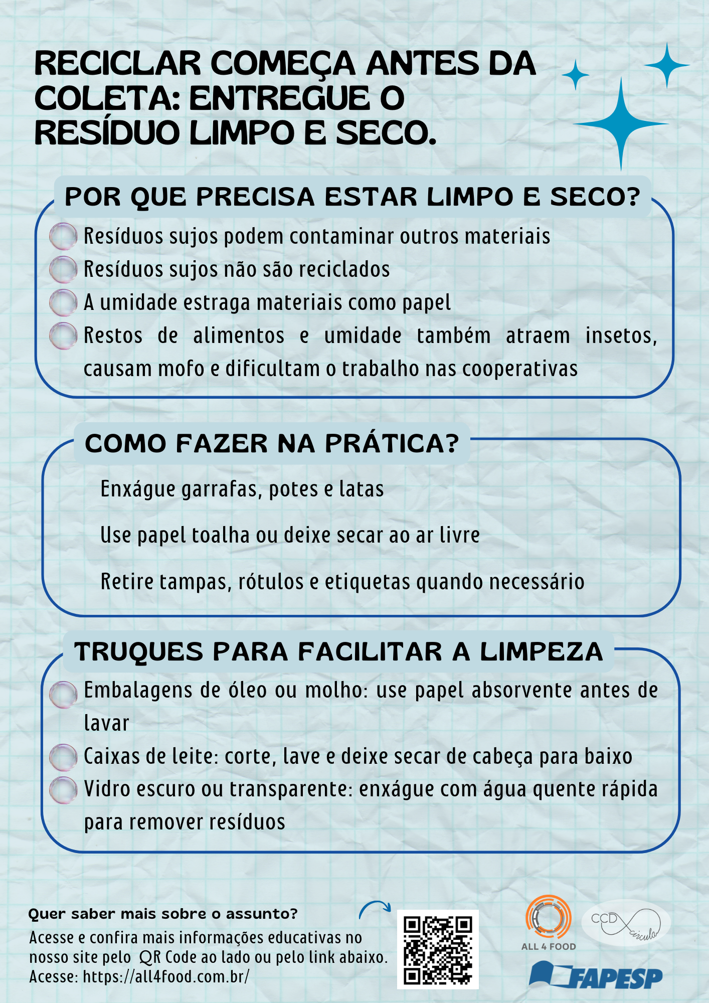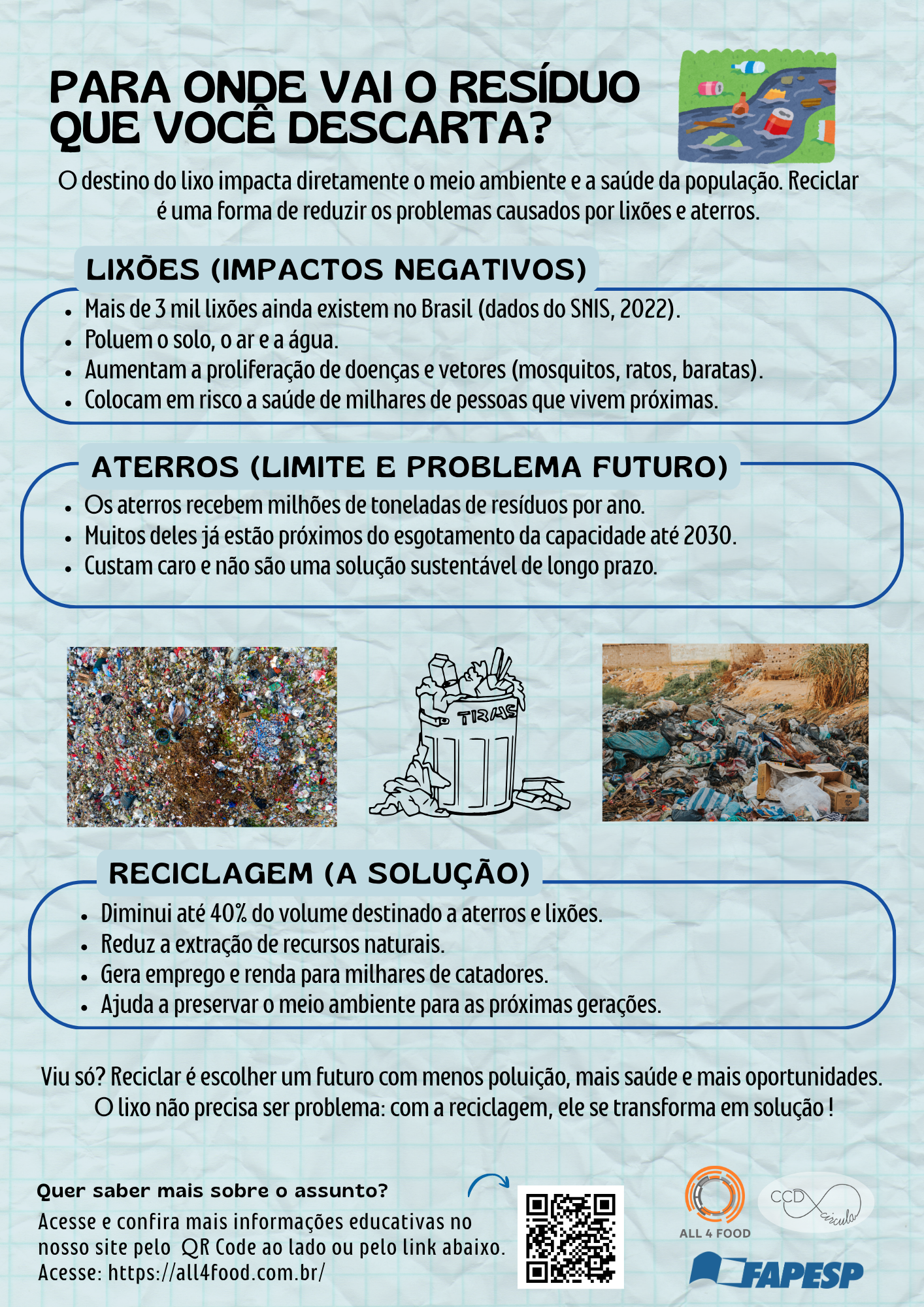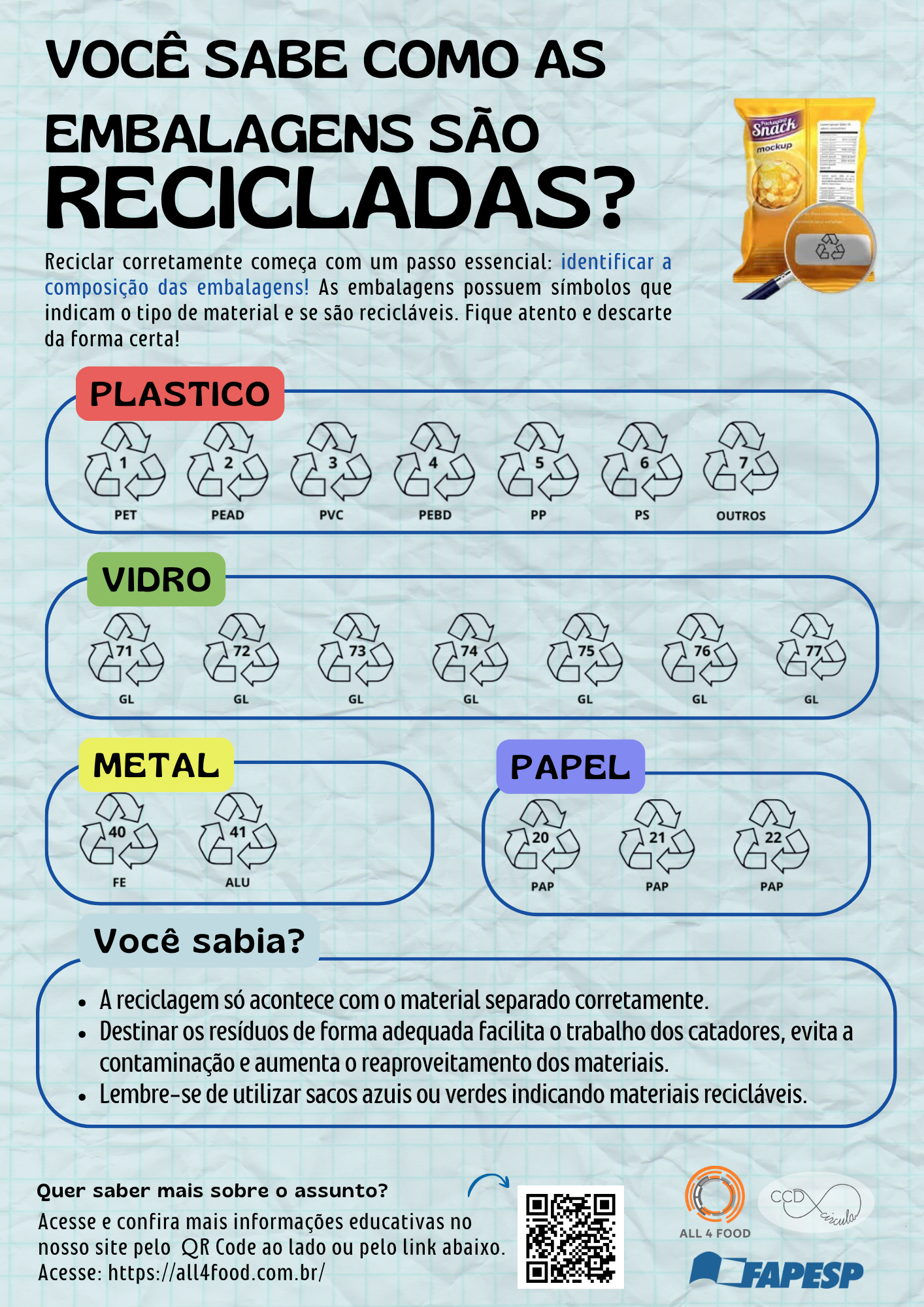 Os infográficos são ótimas alternativas para disseminar informações, eles apresentam conhecimento de forma clara e objetiva. Pensando nisso, em uma parceria da Rede All4Food com o CCD Circula (Centro de Ciência para o Desenvolvimento de Soluções para os Resíduos Pós-Consumo: Embalagens e Produtos), foi criado diversos “flyers”, materiais gráficos que abordam temas de extrema relevância nos dias atuais, como economia circular, sustentabilidade, e com foco principal em resíduo gerado no dia a dia, o que fazer com tudo isso?