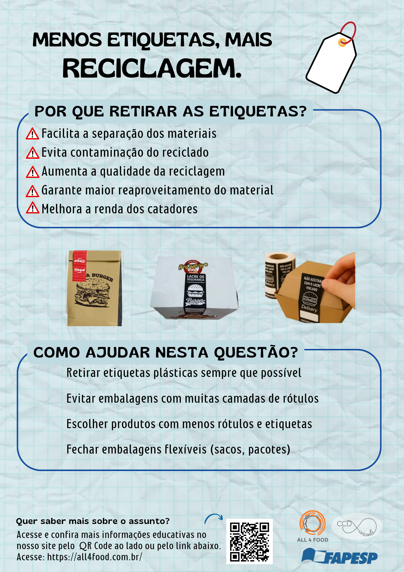 O infográfico destaca a importância de retirar etiquetas das embalagens para facilitar a reciclagem, evitando contaminações e melhorando a qualidade do material reciclado.