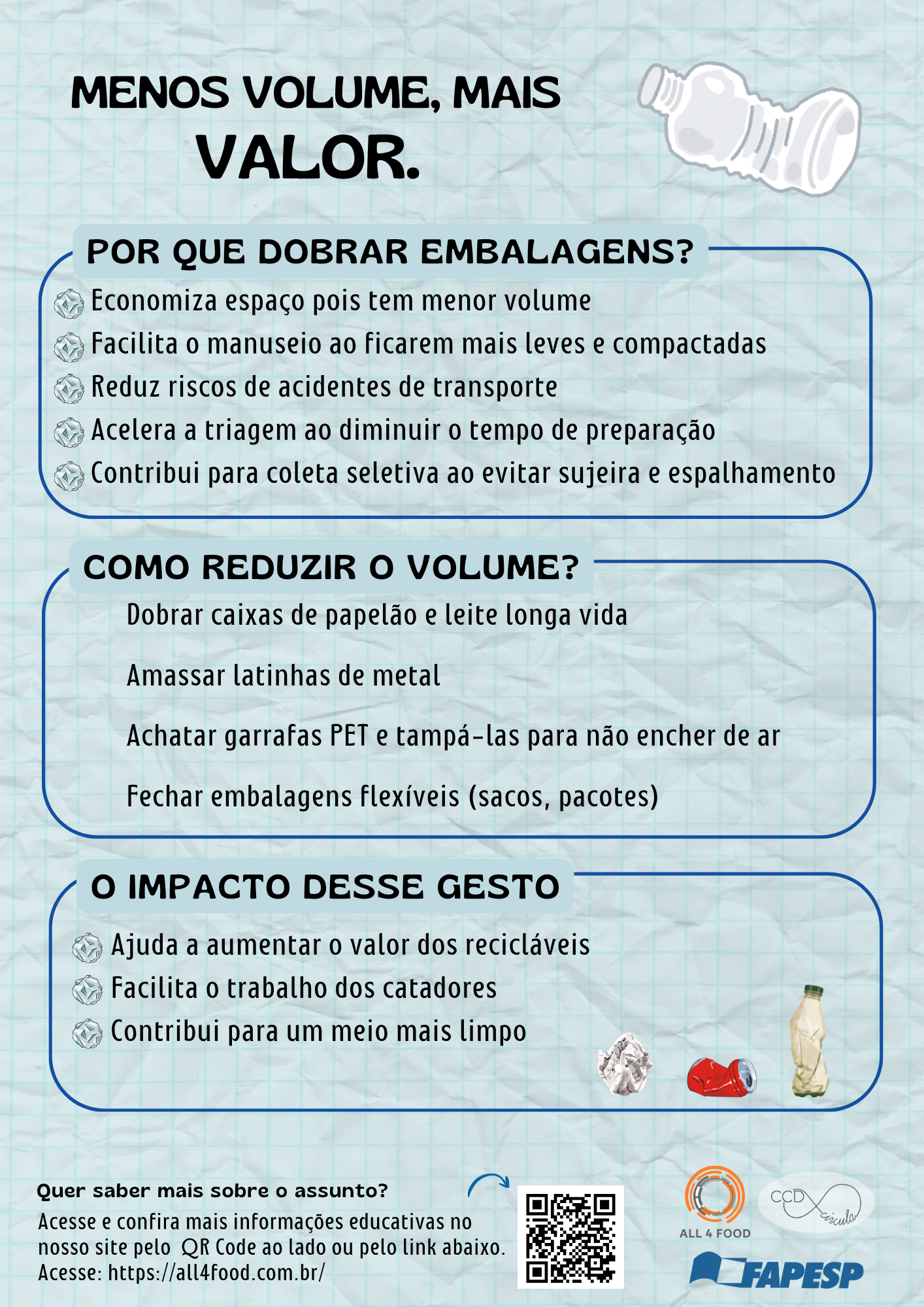 O infográfico destaca a importância de reduzir o volume das embalagens antes de descartá-las, orientando dobrar e amassar para economizar espaço, facilitar a reciclagem e ajudar catadores.
