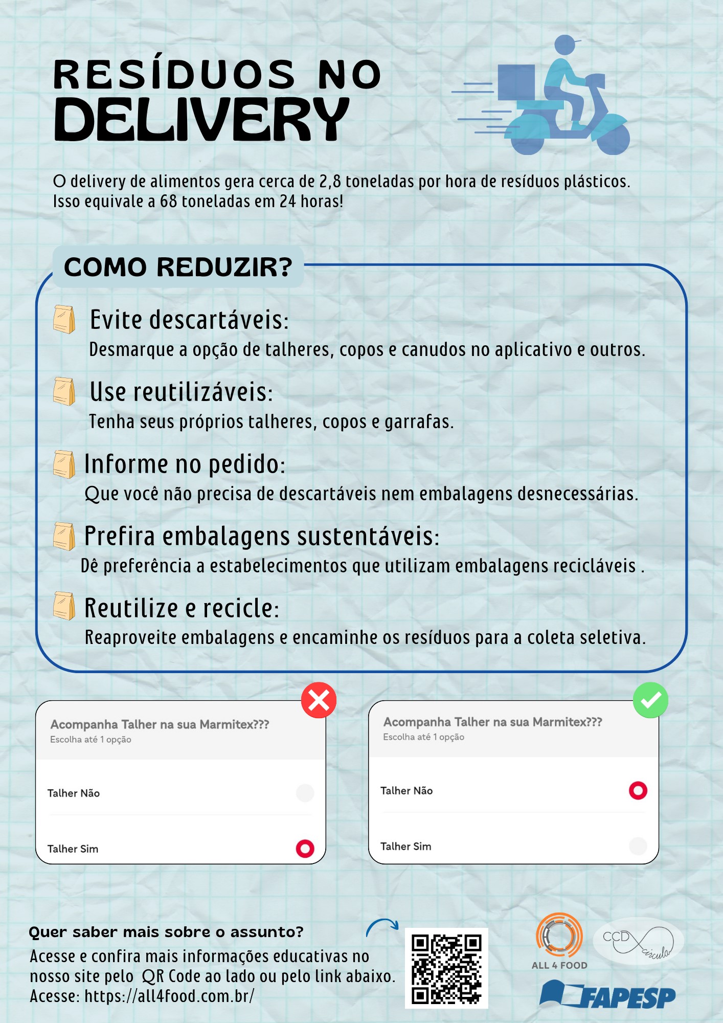 O infográfico alerta sobre os resíduos do delivery, que geram grande quantidade de plástico descartável. Como sugestão evidencia evitar talheres e copos descartáveis, usar itens reutilizáveis e informar no pedido que não há necessidade de embalagens extras.
