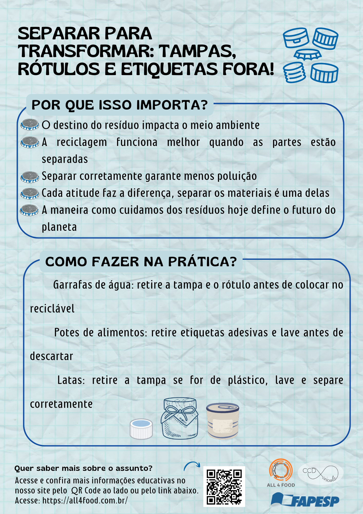 O infográfico reforça a importância de retirar tampas, rótulos e etiquetas das embalagens antes do descarte, isso melhora a reciclagem e garante maior aproveitamento dos materiais.